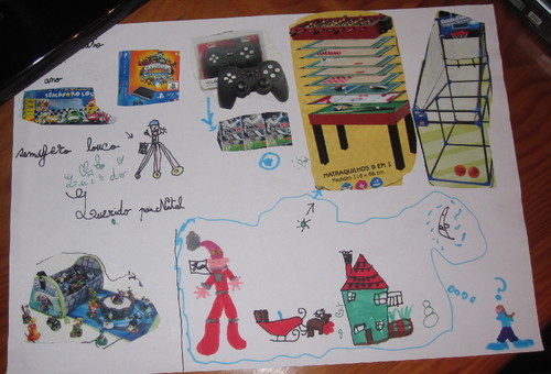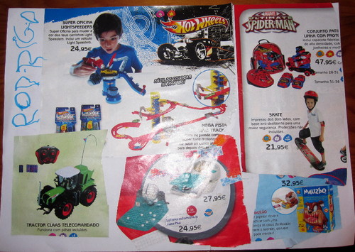 O mini-filho recortou tudo quanto encontrou (e eu deixei porque precisa muito de praticar o recorte) e depois foi colando até se lhe acabar o espaço na folha. Está determinado em ter uns patins e um skate... e eu nem sei o que achar disso. Por um lado são a cara dele, por outro tenho medo que quando perceber que andar em cima deles não é fácil, queira desistir (e, por enquanto, deixamos fora da equação as mazelas que vêm sempre com estas traquitanas). Também sabe que só vai ter um presente do Pai Natal... mas tem a enorme vantagem de fazer anos entretanto.