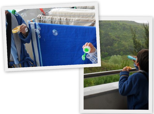 O dia acordou frio e muito chuvoso mas, logo de manhã, houve bolas de sabão na varanda.