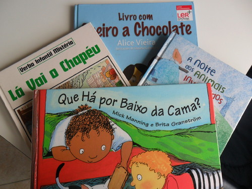 Já não passávamos pela biblioteca há muito tempo - francamente nem sei bem onde param os cartões - mas na semana passada acabámos por lá entrar. Trouxemos 4 livros, dois escolha minha ("A noite dos animais inventados" e "Livro com cheiro a chocolate"), outros dois escolhas deles.