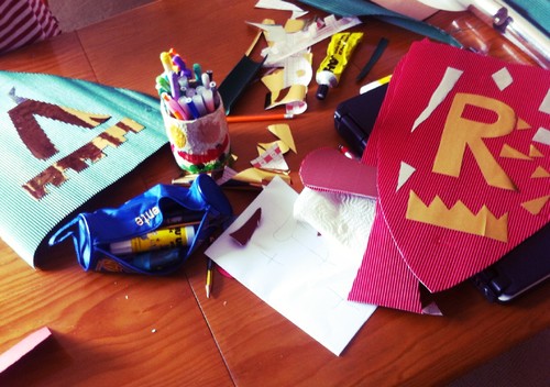 Saibam também que, apesar da minha aparente disponibilidade e das minhas palavras de apoio, no meu interior, digo palavras menos simpáticas e tenho pensamentos muito maus quando, às 11 da manhã de um sábado, tenho a sala revirada e o chão da casa inteira coberto de bocadinhos de cartolina, papel, musgami e papel autocolante... e cola líquida a precisar de ser raspada da mesa da sala. A mesma que está coberta de canetas e lápis que vão escorregando para o chão.