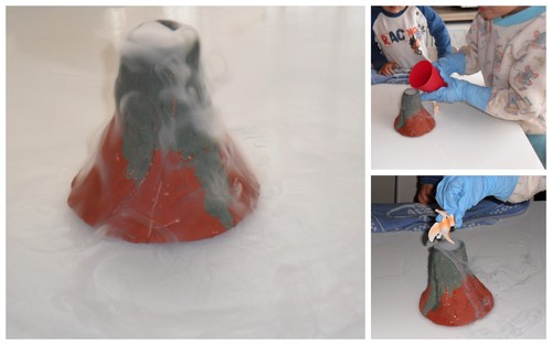 Há duas semanas a tia Rita, cientista a sério, passou o fim-de-semana cá em casa. Trouxe gelo seco e passaram um bom bocado a brincar às erupções de vulcão (feito pelo crescido e pelo pai no Verão) e às bombinhas de gelo seco.